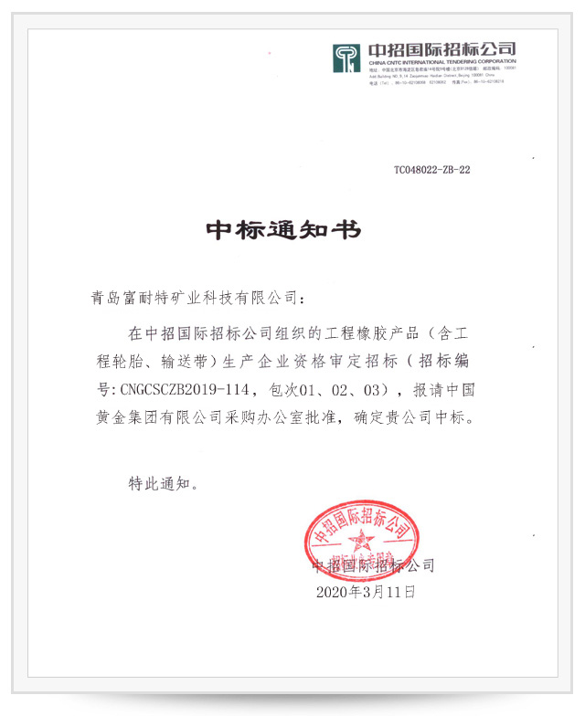 日前中國黃金集團有限公司(以下簡稱中國黃金)召開招標會議,組織中國黃金所屬14家企業通過電子商務形式招標采購所需的工程橡膠產品。青島好色先生在线视频礦業科技有限公司以不俗的實力“連中三元”,中標中國黃金集團2020年度三大類別橡膠產品。